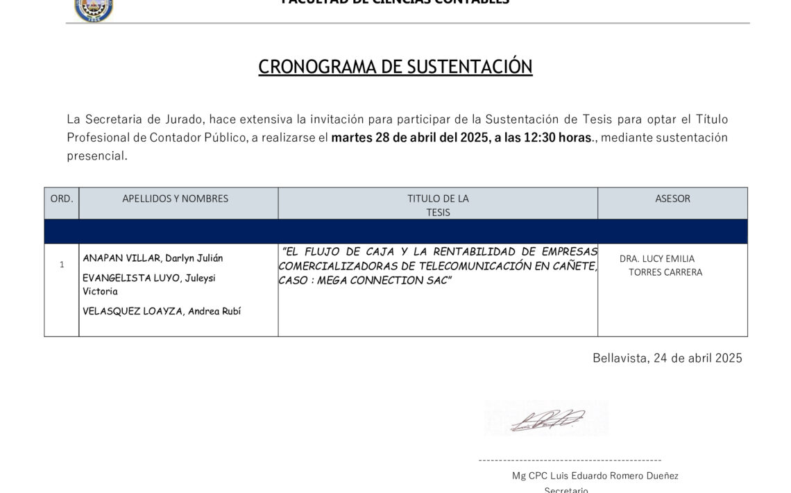 Posted on 28/04/2025 Editor FCC No Comments CRONOGRAMA DE SUSTENTACIÓN DE TESIS/TITULACIÓN PROFESIONAL Read More