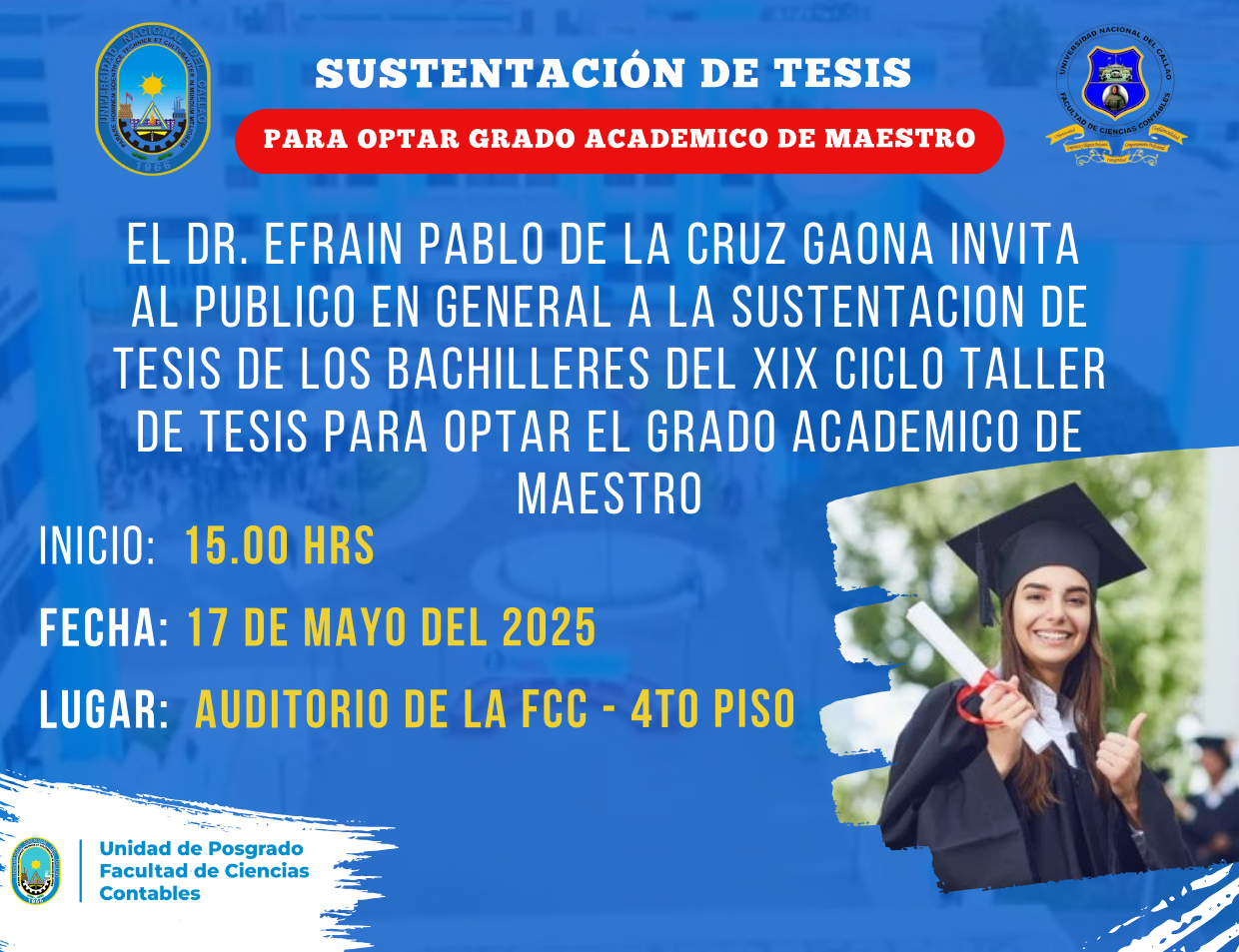 Posted on 15/05/2025 Editor FCC No Comments SUSTENTACIÓN DE TESIS PARA OPTAR EL GRADO ACADEMICO DE MAESTRO DEL XIX CICLO TALLER DE TESIS