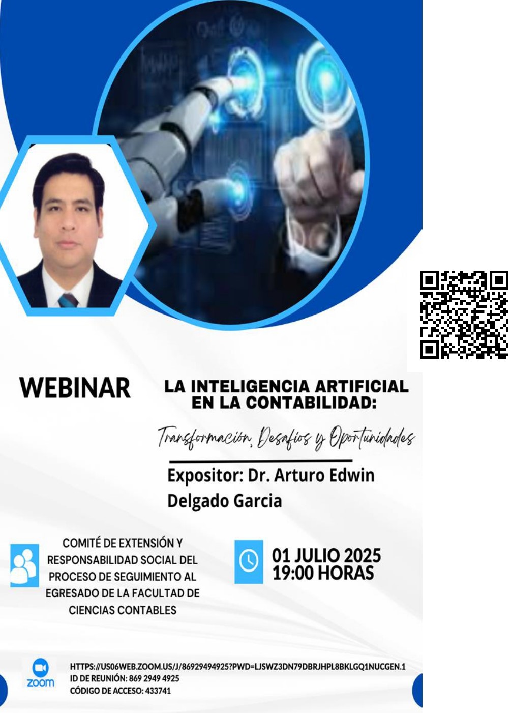 Posted on 16/06/2025 Editor FCC No Comments WEBINAR CERS – FCC – UNAC: “LA INTELIGENCIA ARTIFICIAL EN LA PROFESIÓN CONTABLE: TRANSFORMACIÓN, DESAFÍOS Y OPORTUNIDADES” IR AL ENLACE ZOOM WEBINAR: “LA INTELIGENCIA ARTIFICIAL EN LA CONTABILIDAD”FECHA: Martes 01 de julio del 2025HORA: 19:00 p.m.ZOOM: https://us06web.zoom.us/j/86929494925?pwd=lJSwZ3dN79DbrJHPL8bKlGQ1Nucgen.1